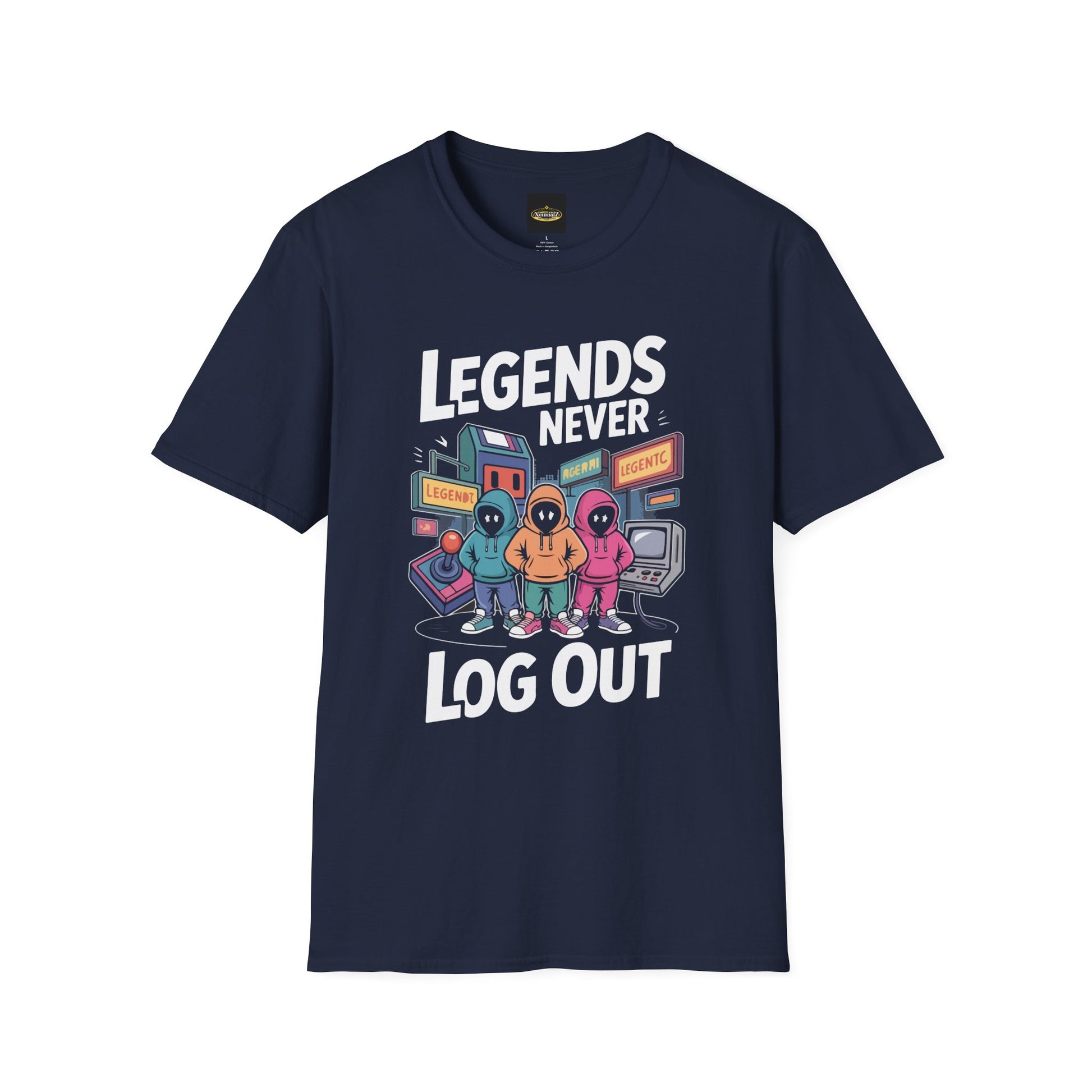 This black softstyle tee brings gamer nostalgia and playful bravado together. Bold, colorful characters stand in front of retro arcade cabinets beneath the cheeky slogan “Legends Never Log Out,” making the shirt feel like a late-night LAN session turned into wearable art. Lightweight and smooth, it sits comfortably under hoodies or on its own during weekend streams and arcade runs. The clean crew neckline and classic fit let the design take center stage while the tear-away label keeps you comfortable during marathon play. Wear it when you want to celebrate long sessions with friends, grab a laugh in the chat, or keep that pixel-era energy close even after you close the console.